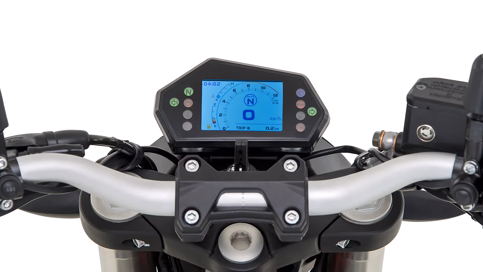 The LCD digital display features an analogue tachometer showing the sweep of rpms, clock, speedometer, gear selection, odometers, fuel level, and temperature gauge. All lighting is LED, from the multi-beam headlight to the blinkers. Available in Flash Green, Red, and Black. MSRP is $4,899.